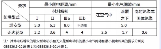 2. 增安型和無(wú)火花型電機(jī)都對(duì)電氣間隙和爬電距離有要求,但在相同電壓等級(jí)下,增安型電動(dòng)機(jī)帶電部件間的最小電氣間隙和最小爬電距離要求比無(wú)火花型電動(dòng)機(jī)的大(詳見表 1),并且無(wú)火花電機(jī)使用的絕緣部件的材料級(jí)別可低至 Ⅲb 級(jí),而增安型電機(jī)需使用 Ⅲa 及以上級(jí)別的。