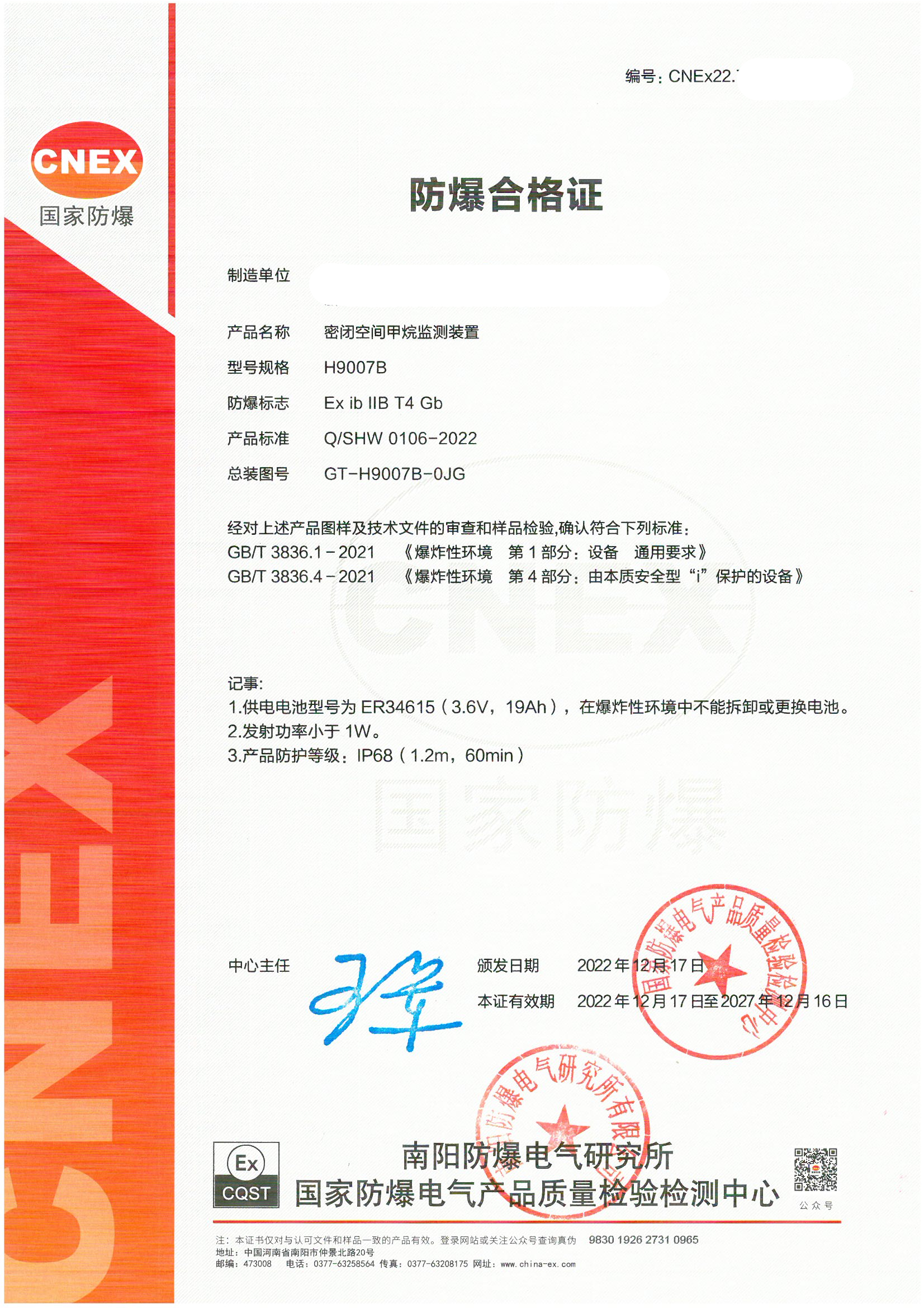 甲烷監(jiān)測裝置辦理本安型防爆合格證標(biāo)準(zhǔn)要求