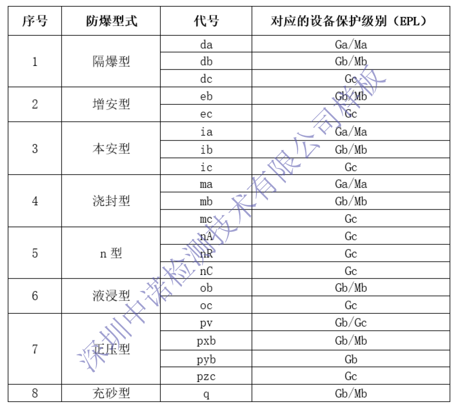 二、防爆保護(hù)型式,即設(shè)備采取的防爆保護(hù)措施,防爆保護(hù)型式以及對(duì)應(yīng)的代號(hào)關(guān)系見下表。